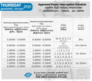 இன்று (21) வியாழக்கிழமை 03 மணித்தியாலங்களுக்கு மின்வெட்டை அமுல்படுத்துவதற்கு பொது பயன்பாடுகள் ஆணைக்குழு அனுமதி வழங்கியுள்ளது.