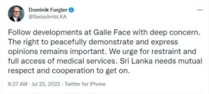கொழும்பு காலிமுகத்திடல் பகுதியில் ஜனாதிபதி செயலகத்திற்கு முன்னால் நள்ளிரவில் ஆர்ப்பாட்டக்காரர்களிற்கு எதிராக எடுக்கப்பட்ட நடவடிக்கை குறித்து சுவிஸ்லாந்து உயர்ஸ்தானிகர் டொமினிக் ஃபர்க்லர் ஆழ்ந்த கவலையும் கண்டனமும் வெளியிட்டுள்ளார்.