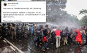 ஒரே இரவில் காலி முகத்திடலில் இடம்பெற்ற நிகழ்வுகள் கவலையளிக்கின்றன. பேச்சு சுதந்திரம், ஊடக சுதந்திரம் மற்றும் அமைதியான போராட்டத்திற்கான உரிமை ஆகியவை அனைத்து சுதந்திரமான சமூகங்களின் அடித்தளமாகும். எனவே அவை பாதுகாக்கப்பட வேண்டும் என நியூசிலாந்து உயர்ஸ்தானிகர் மைக்கல் எப்பல்டன் குறிப்பிட்டுள்ளார்.
