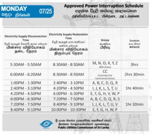 இன்று (25) திங்கட்கிழமை 03 மணித்தியாலங்களுக்கு மின்வெட்டை அமுல்படுத்துவதற்கு பொது பயன்பாடுகள் ஆணைக்குழு அனுமதி வழங்கியுள்ளது.