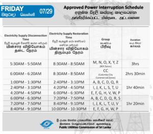 இன்று (29) வெள்ளிக்கிழமை 03 மணித்தியாலங்களுக்கு மின்வெட்டை அமுல்படுத்துவதற்கு பொது பயன்பாடுகள் ஆணைக்குழு அனுமதி வழங்கியுள்ளது.