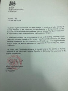 ஜனாதிபதி ரணில் விக்கிரமசிங்கவிற்கு பிரித்தானியாவின் இரண்டாவது எலிசபெத் மகாராணி தனது வாழ்த்துக்களை தெரிவித்துள்ளார்.