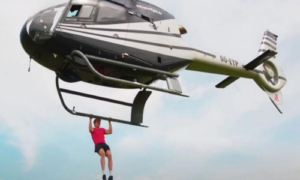 பெல்ஜியத்தின் ஆன்ட்வெர்ப்பில் உள்ள ஹொவெனன் விமான தளத்தில், ஹெலிகாப்டர் குறிப்பிட்ட அடி உயரத்தில் ஒரே நிலையில் அசையாமல் பறந்து கொண்டிருந்தபோது அடிப்பகுதியில் உள்ள கம்பியை பிடித்து கொண்டு புல்-அப்ஸ் செய்தனர்.