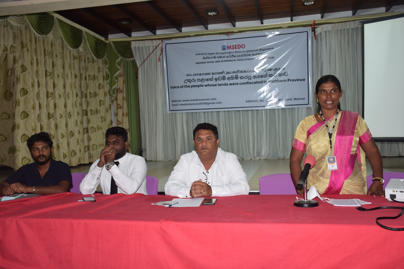 மன்னார் சமூக பொருளாதார மேம்பாட்டுக்கான நிறுவனத்தின் ஏற்பாட்டில் குறித்த நிறுவனத்தின் பணிப்பாளர் ஜாட்சன் பிகிறாடோ தலைமையில் ‘வடமாகாண காணி அபகரிக்கப்பட்டோரின் குரல்’ எனும் தொனிப்பொருளில் 23 ஆம் திகதி செவ்வாய்க்கிழமை காலை 10.30 மணி முதல் மாலை 5 மணி வரை மன்னாரில் உள்ள தனியார் விருந்தினர் விடுதியில் விசேட கலந்துரையாடல் இடம் பெற்றது.