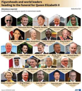 எதிர்வரும் 19ஆம் திகதியன்று, இரண்டாம் எலிசபெத் மகாராணியின் இறுதிச் சடங்குக்காக லண்டனுக்குச் செல்லும் முக்கிய பொருளாதாரங்களின் தலைவர்களைக் காட்டும் ஒரு கிரஃபிக் (வரைகலையை) ஏஃப்பி நிறுவனம் வெளியிட்டுள்ளது.
