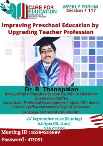 தமிழீழம் முன்பள்ளிக் கல்வியை மேம்படுத்துதல்…..ZOOM Posted on September 24, 2022 at 04:19 by தென்னவள் 188 0 முன்பள்ளிக் கல்வியை மேம்படுத்துதல்