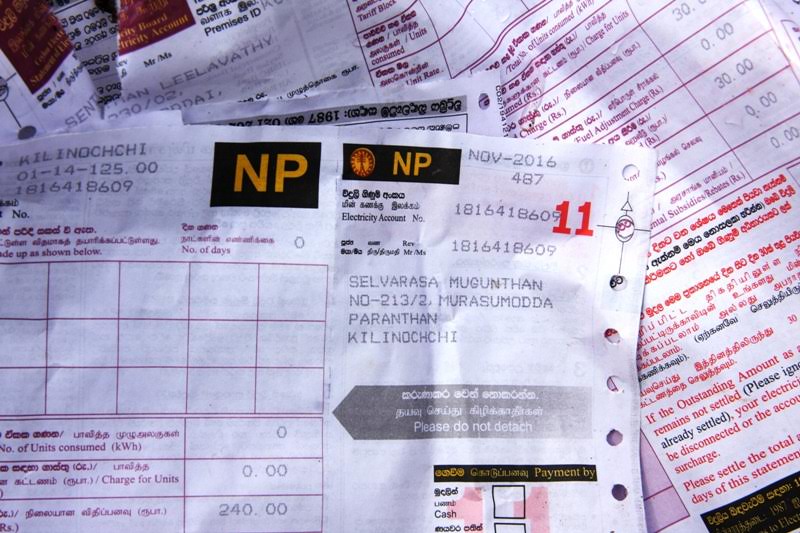 கிளிநொச்சி மாவட்டத்தில் இதுவரைக்கும் பல கிராமங்களில் மின் இணைப்பு வழங்கப்பட்ட நாள் முதல் இன்று வரை மின் கட்டணத்திற்கான சிட்டைகள் வழங்கப்பட்டவில்லை. ஆனால் பல கிராமங்களுக்குரிய நூற்றுக்கணக்கான மின் கட்டண சிட்டைகள் வீதிகளில் சிதறிக்கிடக்கின்றன.கிளிநொச்சி பரந்தன் பூநகரி வீதியில் பொறிக்கடவை சந்தி தொடக்கம் குடமுறுட்டி பாலம் வரையான பகுதிகளில் இவ்வாறு கிளிநொச்சி மின்சார சபையின் மின் கட்டண சிட்டைகள் வீதிகளில் எறியப்பட்டுள்ளது.
