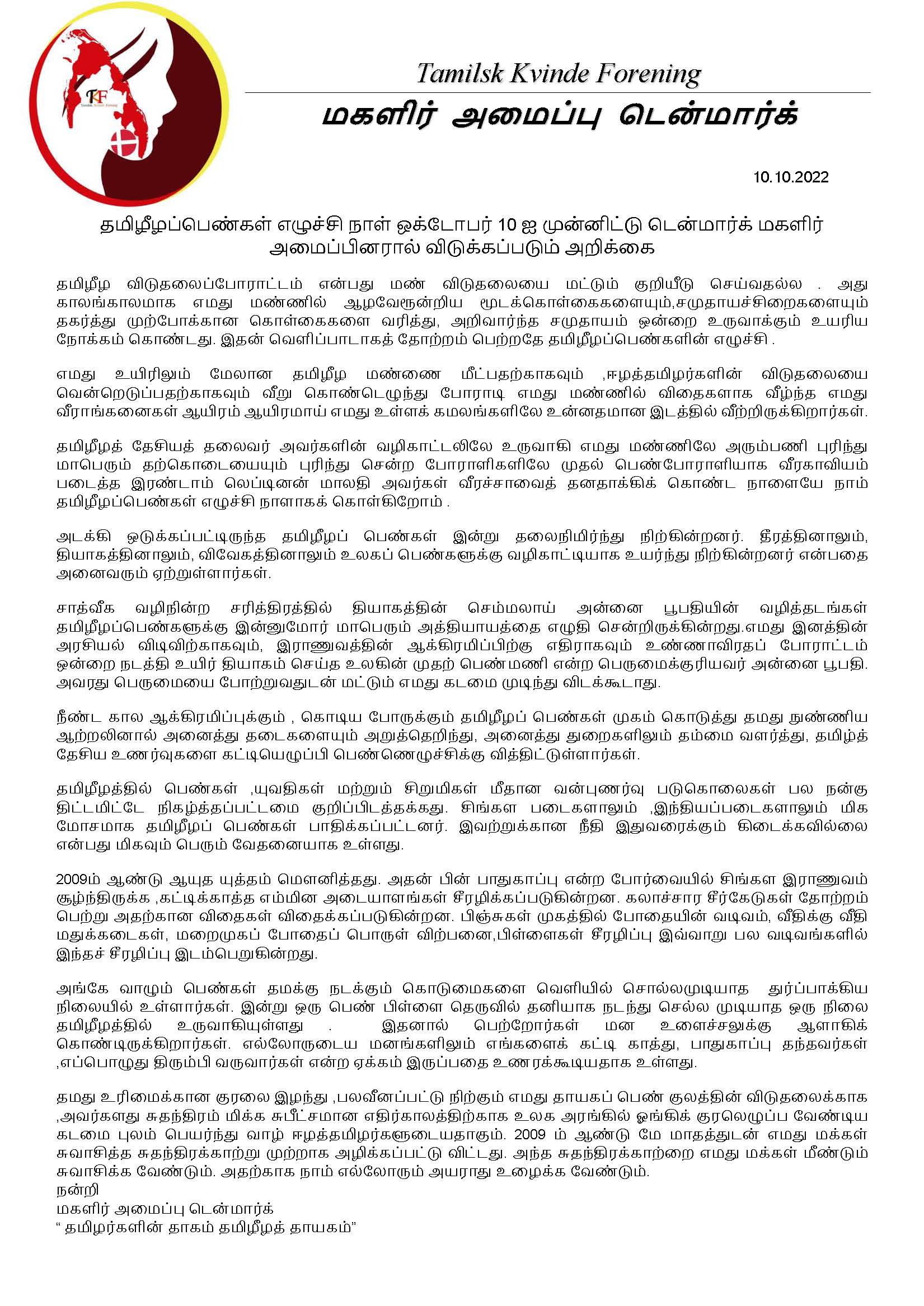 தமது உரிமைக்கான குரலை இழந்து, பலவீனப்பட்டு நிற்கும் எமது தாயகப் பெண் குலத்தின் விடுதலைக்காக, அவர்களது சுதந்திரம் மிக்க சுபீட்சமான எதிர்காலத்திற்காக உலக அரங்கில் ஓங்கிக் குரலெழுப்ப வேண்டிய கடமை புலம் பெயர்ந்து வாழ் ஈழத்தமிழர்களுடையதாகும். 2009ம் ஆண்டு மே மாதத்துடன் எமது மக்கள் சுவாசித்த சுதந்திரக்காற்று முற்றாக அழிக்கப்பட்டு விட்டது. அந்த சுதந்திரக்காற்றை எமது மக்கள் மீண்டும் சுவாசிக்க வேண்டும். அதற்காக நாம் எல்லோரும் அயராது உழைக்க வேண்டும்.