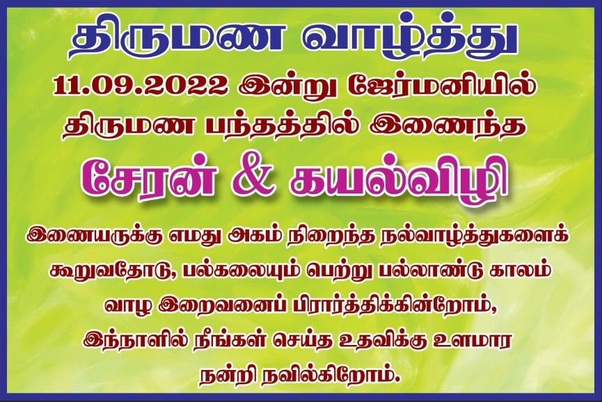 11.09.2022 அன்று யேர்மனியில் திருமண பந்தத்தில் இணைந்த சேரன் ரூ கயல்விழி இணையரின் உறவுகளின் ஏற்பாட்டில் தற்போது நிலவும் பொருளாதார நெருக்கடியில் எங்களது பட்டிணிச்சாவை தீர்க்கும் முகமாக மட்டக்களப்பு மாவட்டத்தின் வெல்லாவெளி பிரதேச செயலாளர் பிரிவிலுள்ள பிலாலிவேம்பு கிராமத்திலுள்ள அனைத்துக் குடும்பங்களும் உள்ளடங்களாக சுமார் 200 பேருக்கு மதிய உணவு வழங்கப்பட்டன. இவ்வுதவிகளைப் பெற்ற மட்டக்களப்பு வாழ் தமிழ் மக்களாகிய நாங்கள் திருமண பந்தத்தில் இணைந்த சேரன் ரூ கயல்விழி இணையருக்கும் அவர்களது உறவுகளுக்கும் எமது அகம் நிறைந்த நல்வாழ்த்துகளைக் கூறுவதோடுஇ பல்கலையும் பெற்று பல்லாண்டு காலம் வாழ வாழ்த்துவதுடன் இந்நன் நாளில் தாங்கள் வழங்கும் இவ்வுதவிக்கு உளமார நன்றி நவில்கிறோம்.