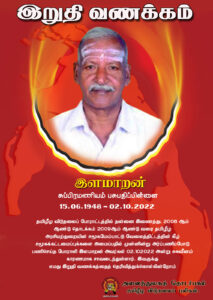 புலம்பெயர் தேசங்களில் சுப்பிரமணியம் பசுபதிப்பிள்ளைக்கு இறுதி வணக்கம் Posted on October 20, 2022 at October 20, 2022 by தென்னவள் 408 0 சுப்பிரமணியம் பசுபதிப்பிள்ளை (இளமாறன்) அவர்களுக்கு அனைத்துலகத் தொடர்பகம் இறுதிவணக்கம் செலுத்தியுள்ளது.