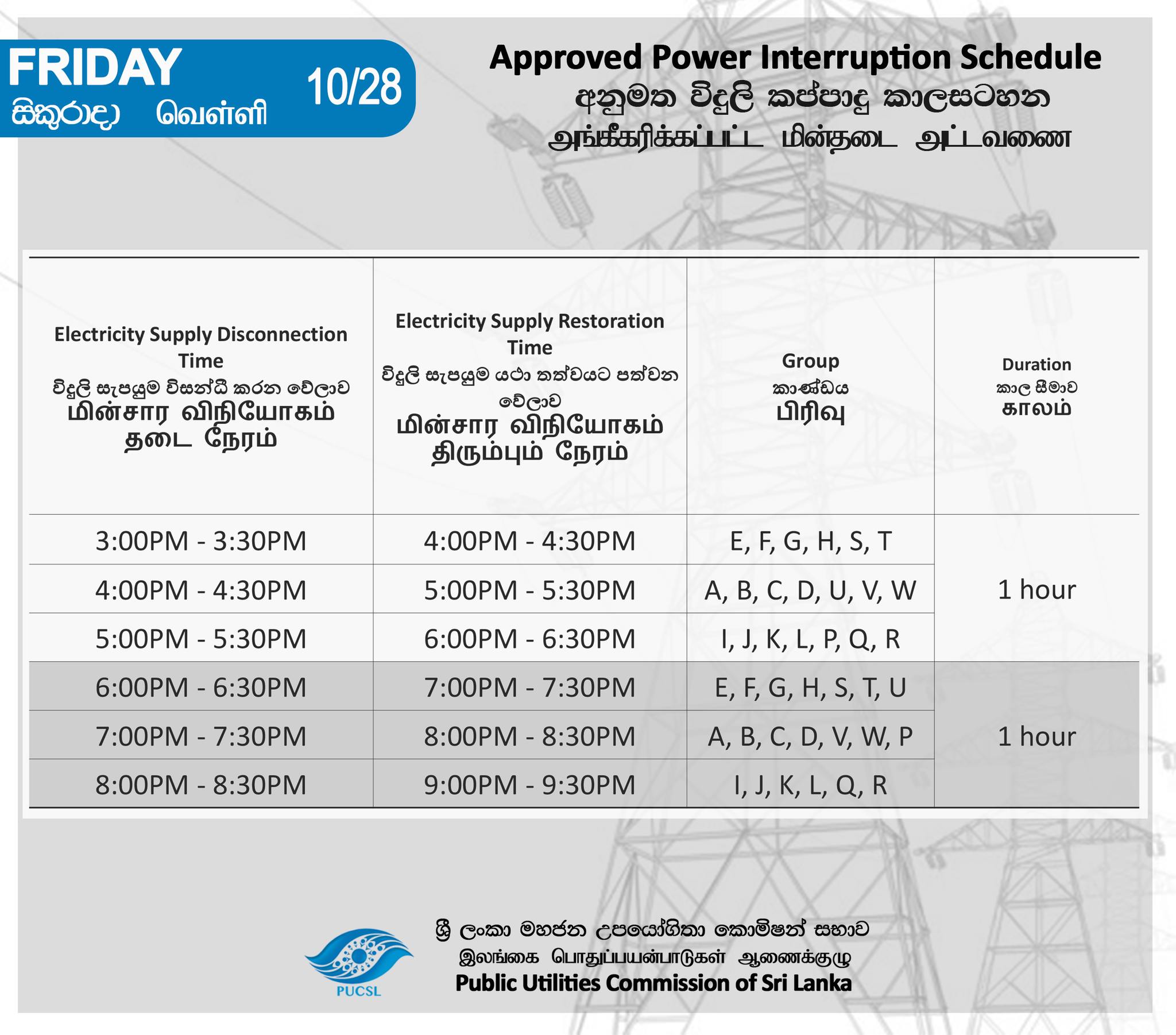 இன்று (28) வெள்ளிக்கிழமை 02 மணித்தியாலங்கள் 20 நிமிடங்களுக்கு மின்வெட்டை அமுல்படுத்துவதற்கு பொது பயன்பாடுகள் ஆணைக்குழு அனுமதி வழங்கியுள்ளது.