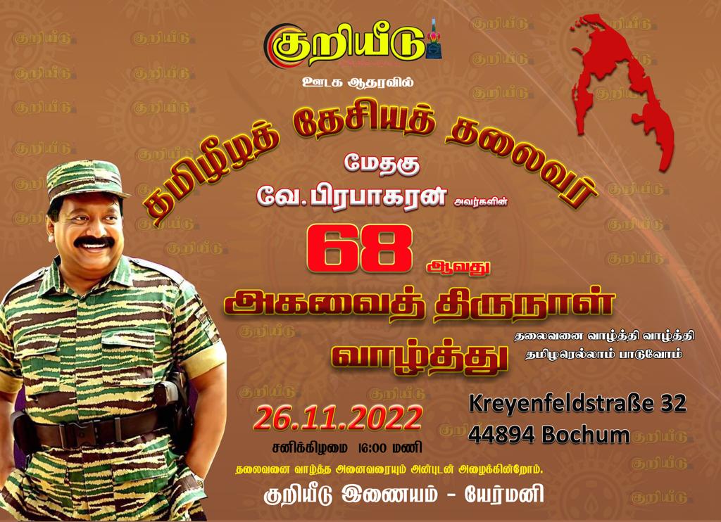 குறியீடு இணையம் ஆதரவுடன் யேர்மனி போகும் நகரத்தில் தமிழீழத் தேசியத் தலைவர் மேதகு வே. பிரபாகரன் அவர்களின் 68 ஆவது பிறந்த திருநாளினைக் கொண்டாடுவதற்கு அனைத்துத் தமிழ்மக்களையும் குறியீடு இணையம் அன்புடன் அழைக்கின்றது.