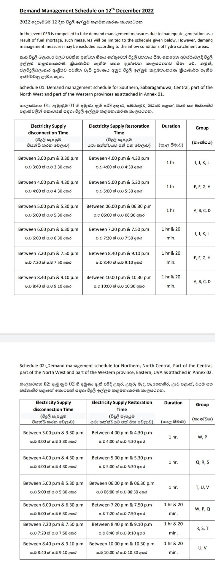 நாடளாவிய ரீதியில் இன்று (டிச 12) திங்கட்கிழமை 02 மணித்தியாலங்கள் 20 நிமிடங்களுக்கு மின்வெட்டை அமுல்படுத்துவதற்கு பொது பயன்பாடுகள் ஆணைக்குழு அனுமதி வழங்கியுள்ளது.