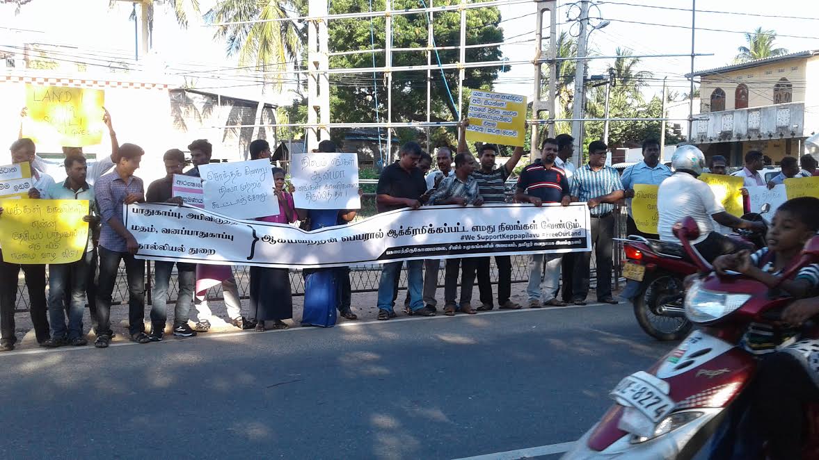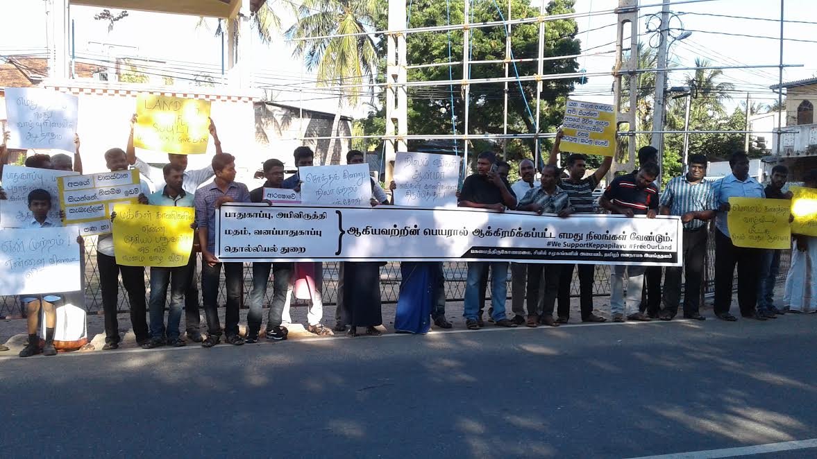 பாதுகாப்பு-அபிவிருத்தி-மதம்.வனப்பாதுகாப்பு.தொல்லியல் துறை ஆகியவற்றின் பெயரால் ஆக்கிரமிக்கப்பட்ட நிலங்கள வேண்டும் என்ற பதாதைகளை ஏந்தியவாறு ஆர்ப்பாட்டத்தில் ஈடுபட்டனர்.