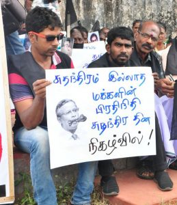 ‘இலங்கைக்குள் காணாமல் ஆக்கப்படல் சம்பவத்தால் பாதிக்கப்பட்டுள்ள முப்பத்து இரண்டாயிரத்துக்கும் அதிகமான குடும்பங்களுக்கு நீதியும் தீர்வும் கேட்டு, நாங்கள் இங்கு பேசவந்துள்ளோம். நீங்கள் சும்மா எழுந்தாமானமாக ஆயிரக்கணக்கானோர்… ஆயிரக்கணக்கானோர்… என்று கூறிக்கொண்டிருக்கிறீயள். காணாமல் ஆக்கப்பட்டோர் பிரச்சினை தொடர்பில் இந்த ஏழு வருடத்தில் நீங்கள் எவ்வளவு கரிசனையோடும் கவனிப்போடும் இருந்திருக்கிறீயள் என்பதற்கு இதுவே சாட்சி.’ என்று நாங்கள் கூற, ‘நான் எங்கே அப்படிக்கூறினேன்?, ‘நான் எங்கே அப்படிக்கூறினேன்?’ என்று சுமந்திரன் எம்.பி வாதிட்டுக்கொண்டிருந்தார். அப்போது சாள்ஸ் நிமலநாதன் எம்.பி, ஆயிரக்கணக்கானோர்… என்று தனது குரலை குரலை தாழ்த்தி இழுக்க… ‘ஓ அது தப்பா? அது தப்பா? ஆயிரக்கணக்கானோர் என்று சொல்வது தப்பா?’ என்று மறுபடியும் சுமந்திரன் எம்.பி முரண்டுபிடித்துக்கொண்டிருந்தார்.