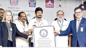 பின்னர் நடந்த விழாவுக்கு ஆட்சியர் ச.விசாகன் தலைமை வகித்தார். அப்போது 6 லட்சம் மரக்கன்றுகள் நட்டு சாதனை படைத்ததற்கான பதக்கம் மற்றும் சான்றிதழை அமெரிக்காவைச் சேர்ந்த எலைட் வேர்ல்டு ரெக்கார்ட் நிறுவன நிர்வாக அதிகாரிகள் ரவி பால்பக்கி,நவுரா ஆகியோர் அமைச்சர் உதயநிதி ஸ்டாலினிடம் வழங்கினர்.