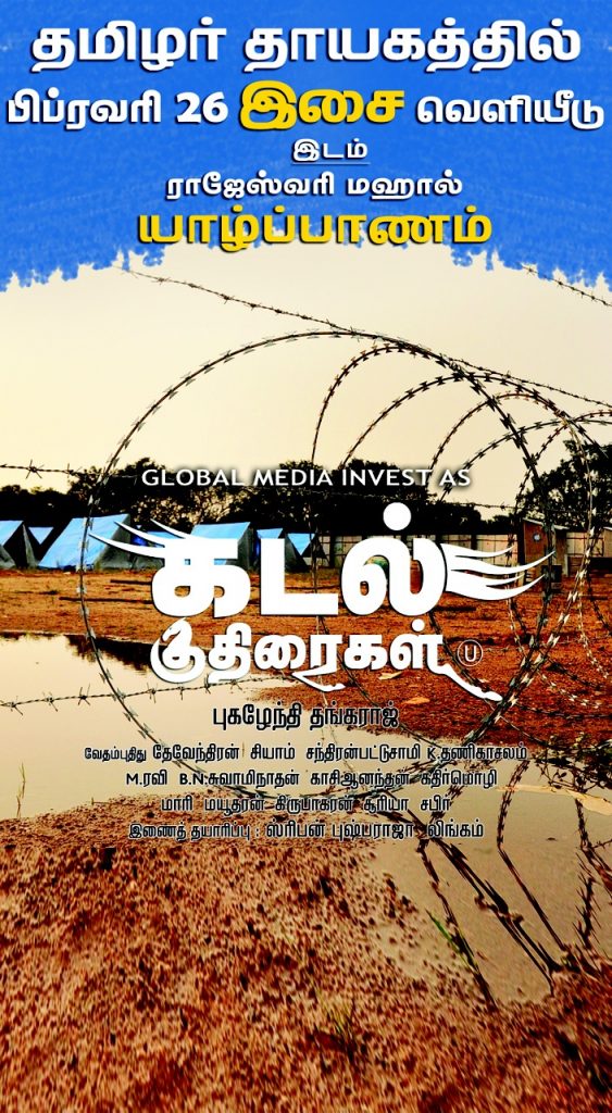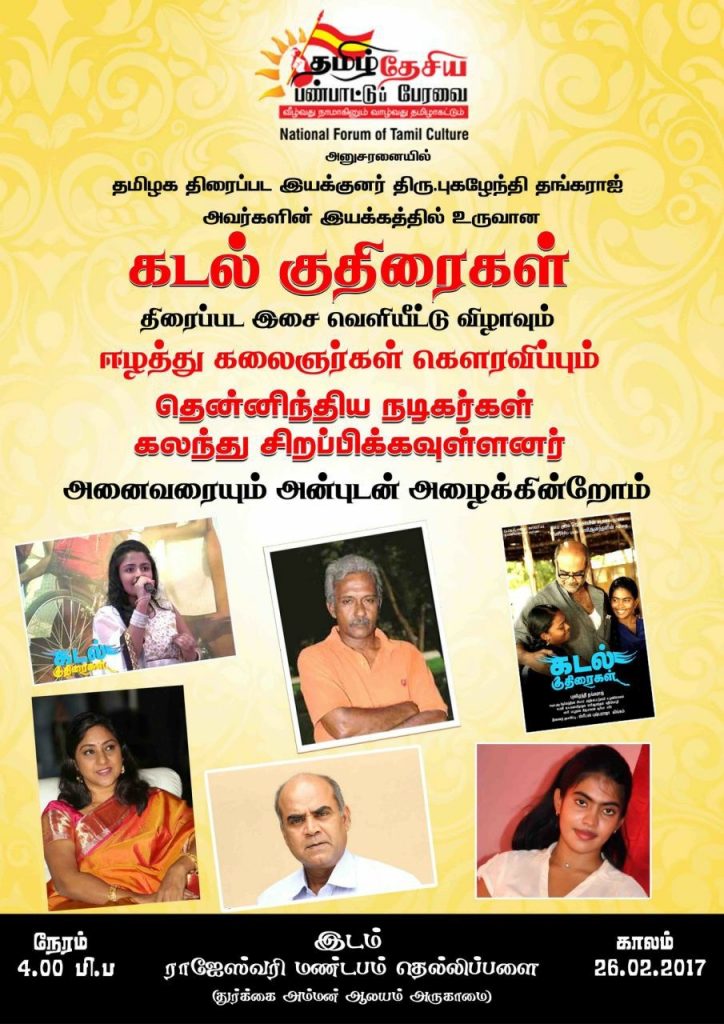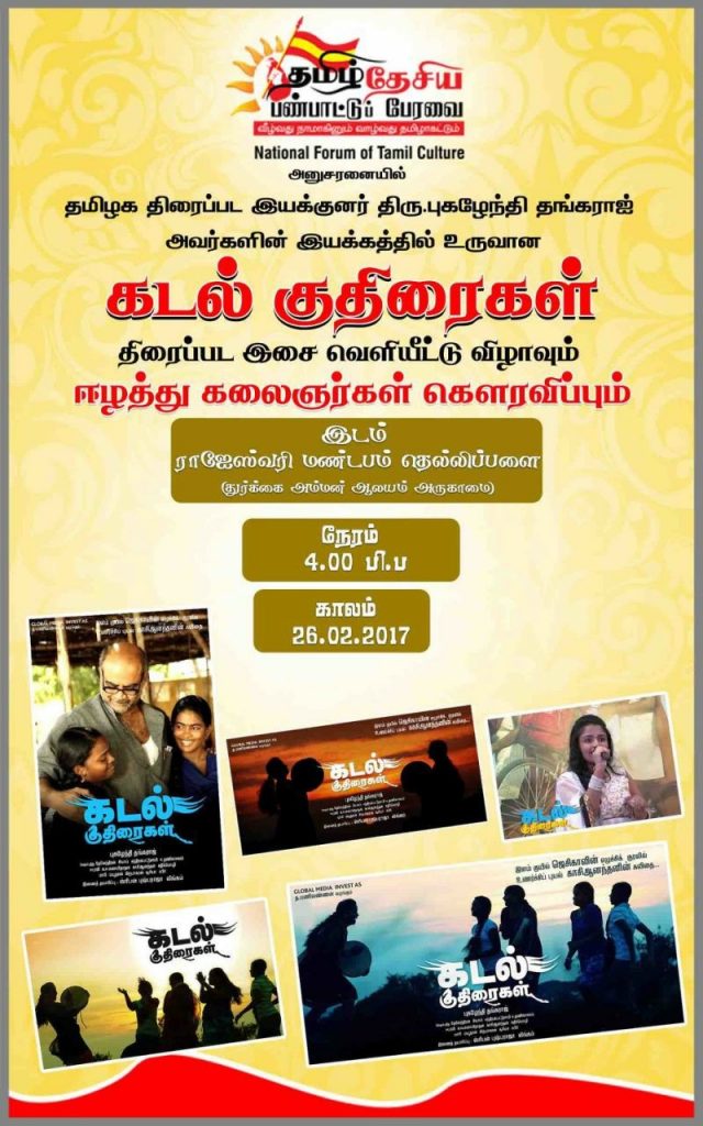 தமிழீழ ஆதரவாளரான புகழேந்தி தங்கராஜ் அவர்களின் இயக்கத்தில் ஆறாவது படைப்பாக உருவாக்கப்பட்டு வெளியீட்டுக்கு தயாரக உள்ள ‘கடல் குதிரைகள்’ திரைப்படத்தின் இசை வெளியீட்டு விழா தமிழீழத்தின் பண்பாட்டுத் தலைநகரான யாழ்ப்பாணத்தில் வரும் 26 ஆம் திகதி ஞாயிறு மாலை 4 மணிக்கு நடைபெற உள்ளது.
