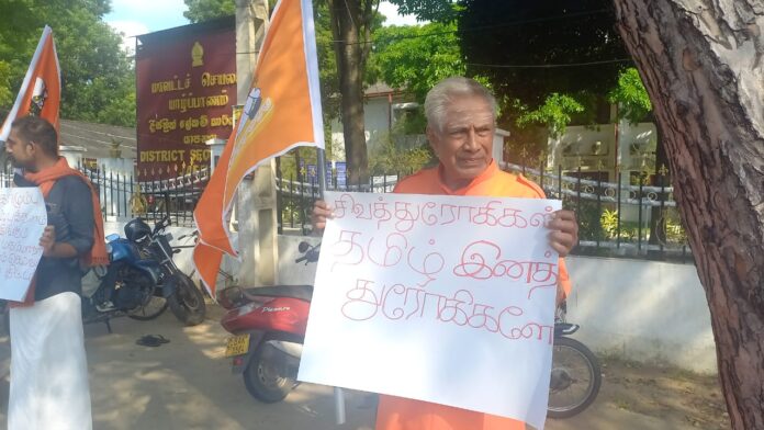 போராட்டத்தில் ஈடுபட்டவர்கள் “சிவத் துரோகிகள் தமிழ் இனத் துரோகிகள்” உள்ளிட்ட பல வாசகங்கள் எழுதப்பட்ட பதாதைகளை ஏந்தியவாறு போராட்டத்தில் ஈடுபட்டனர்.