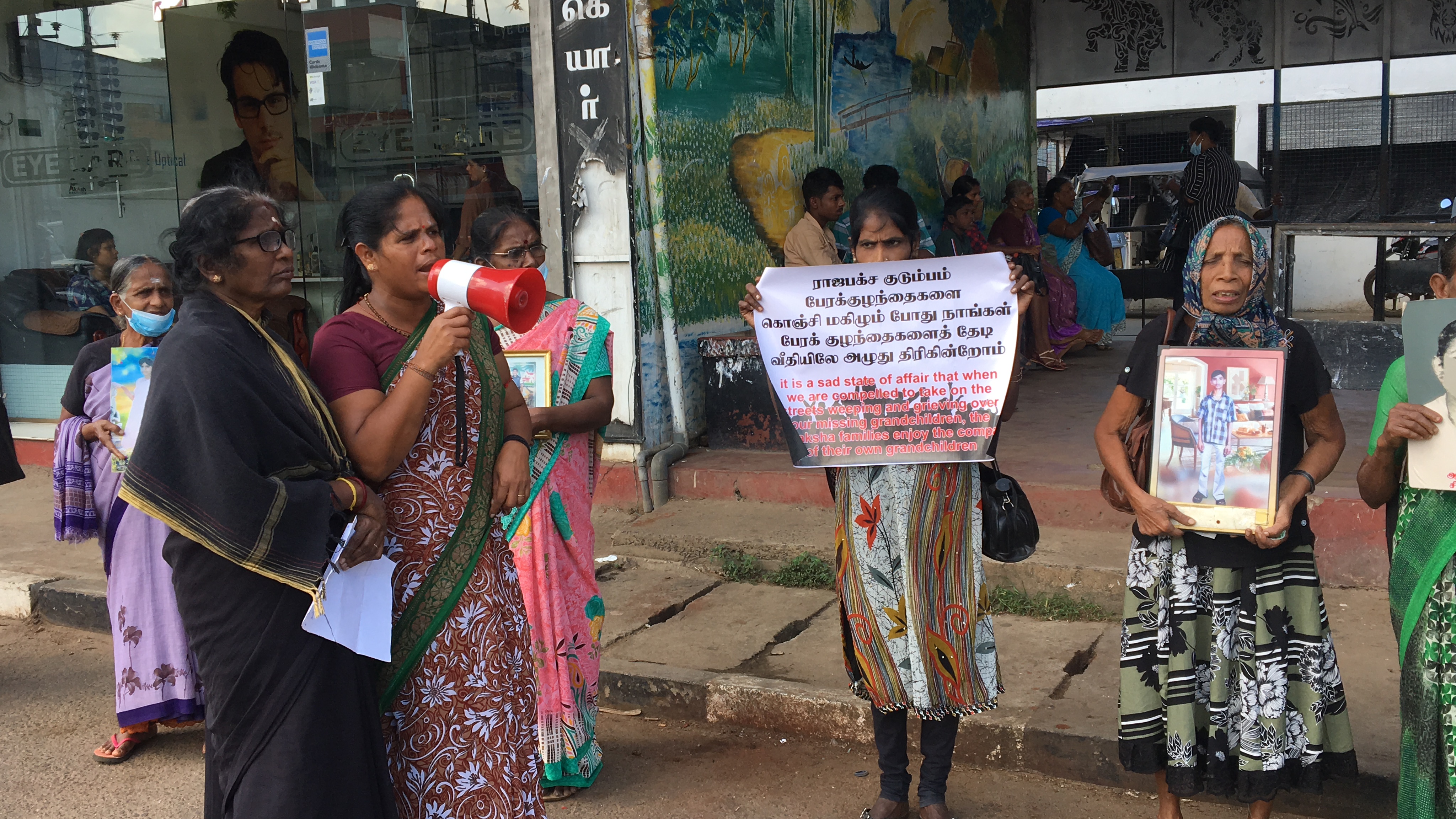 இதன்போது காணாமல் ஆக்கப்பட்ட தமது உறவுகளின் படங்களையும், பதாதைகளையும் ஏந்தியிருந்த உறவுகள் ‘ராஜபக்ச குடும்பம் பேரக்குழந்தைகளை கொஞ்சி மகிழும் போது நாங்கள் பேரக் குழந்தைகளைத் தேடி வீதியில் அழுது திரிகிறோம்.