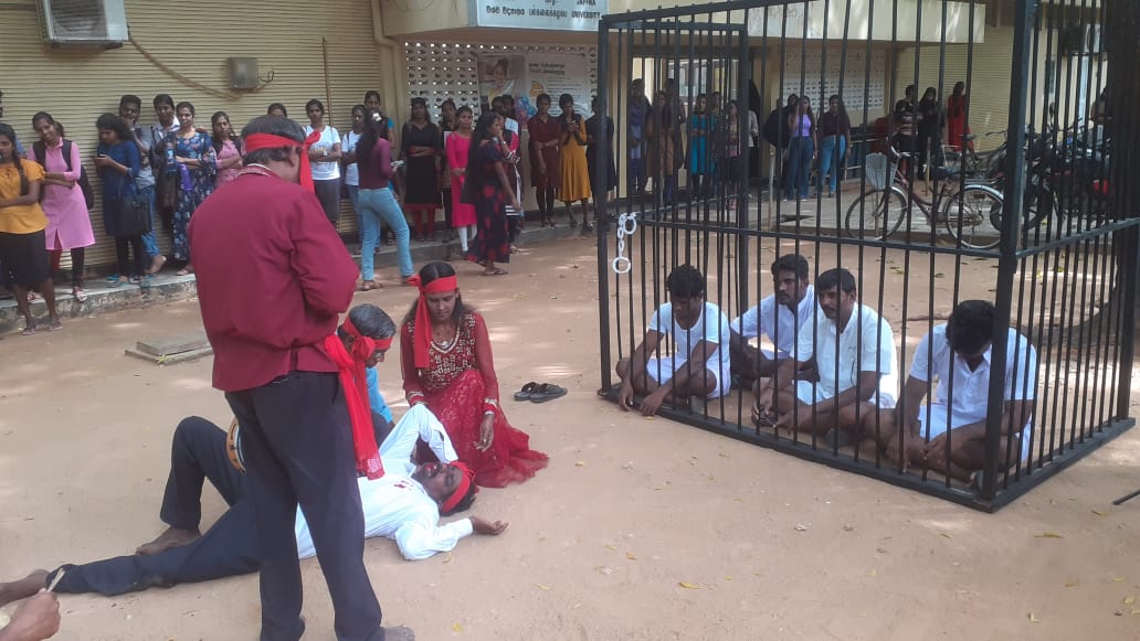 அரசியல் கைதிகளின் விடுதலையை வலியுறுத்தி யாழ். பல்கலைக்கழக மாணவர் ஒன்றியத்தோடு குரலற்றவர்களின் குரல் அமைப்பினர் இணைந்து வீதி விழிப்புணர்வு நாடகமொன்றினை யாழ். பல்கலைக்கழக மாணவர் ஒன்றிய கேட்போர் கூட வளாகத்துக்கு முன்பாக இன்று (13) நடத்தியுள்ளனர்.