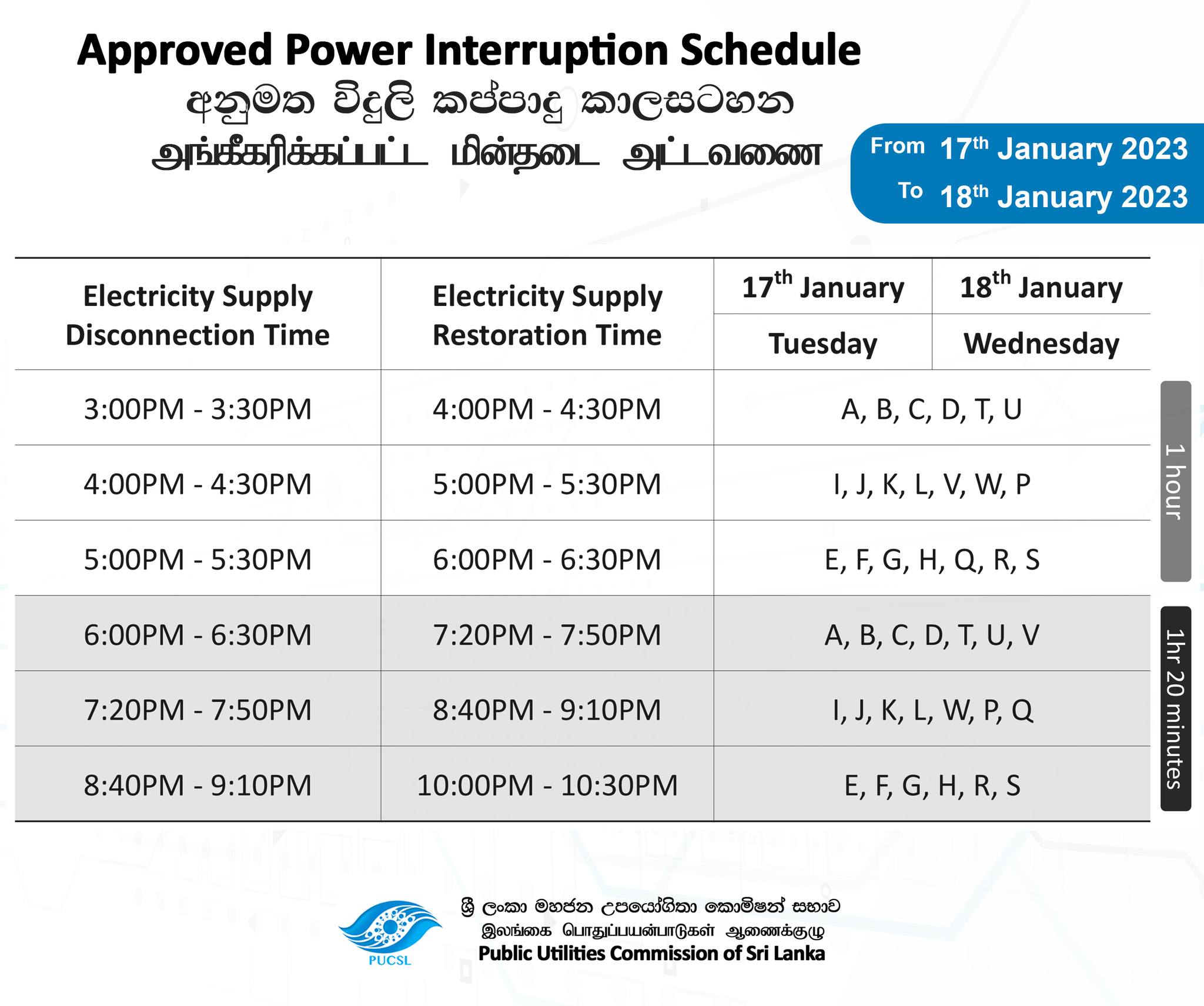 நாடளாவிய ரீதியில் இன்று (ஜன 17) செவ்வாய்க்கிழமை 02 மணித்தியாலங்கள் 20 நிமிடங்களுக்கு மின்வெட்டை அமுல்படுத்துவதற்கு பொது பயன்பாடுகள் ஆணைக்குழு அனுமதி வழங்கியுள்ளது.