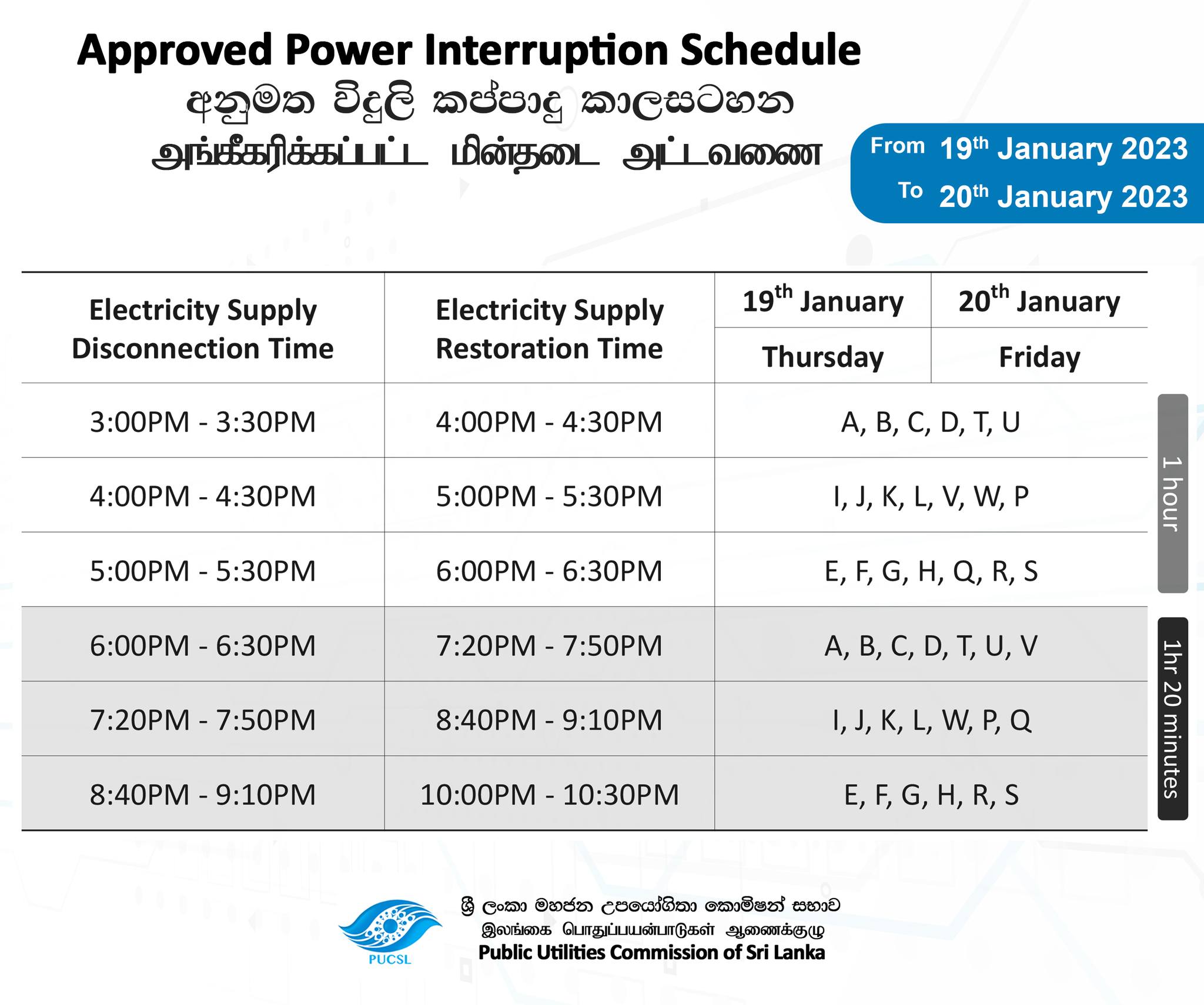 நாடளாவிய ரீதியில் இன்று (ஜன 19) வியாழக்கிழமை 02 மணித்தியாலங்கள் 20 நிமிடங்களுக்கு மின்வெட்டை அமுல்படுத்துவதற்கு பொது பயன்பாடுகள் ஆணைக்குழு அனுமதி வழங்கியுள்ளது.
