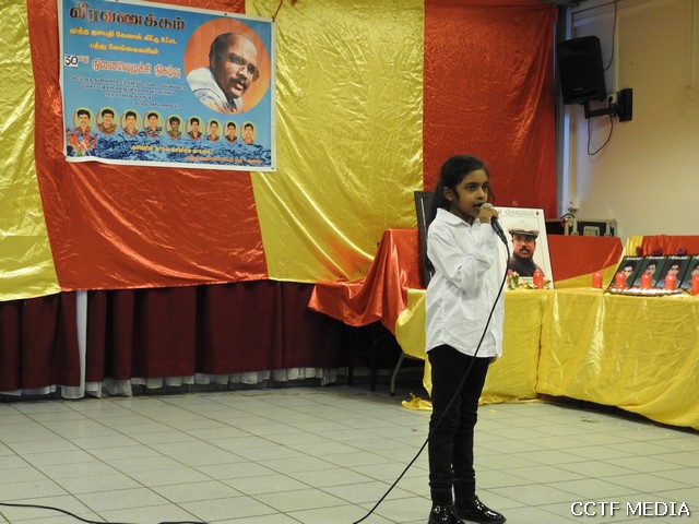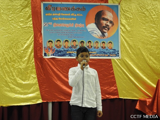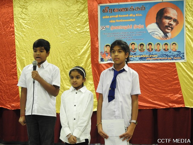 அகவணக்கத்தைத் தொடர்ந்து நிகழ்வில் கலந்துகொண்ட அனைவரும் சுடர் ஏற்றி மலர்வணக்கம் செலுத்தினர்.அரங்க நிகழ்வுகளாக கரோக்கி இசையுடன் மாவீரர் நினைவு சுமந்த பாடல்கள். தமிழ்ச் சோலை மாணவிகளின் விடுதலைப் பாடல்களுக்கான நடனங்களும், கேணல் கிட்டு நினைவு சுமந்த கவிதை மற்றும் பேச்சுக்கள் என்பன சிறப்பாக இடம்பெற்றன. கரோக்கி இசைப்பாடல்களை தமிழ்ச்சோலை மாணவர்களும் தமிழர்கலைபண்பாட்டுக்கழக பாடகர்களும் பாடியிருந்தனர். நடனங்களை புளோமினில் தமிழ்ச்சோலை, திரான்சி தமிழ்ச்சோலை, ஆகியவற்றின் மாணவிகள் நடாத்தியிருந்தனர்.