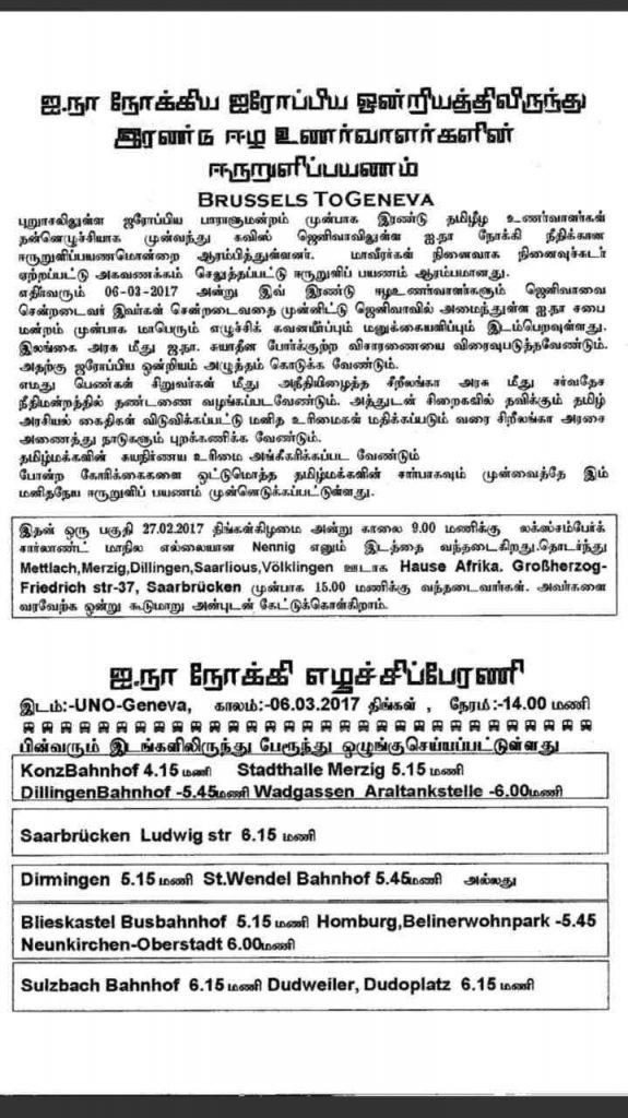 எமது சுதந்திர விடுதலைப் போராட்டத்துக்கு வலுச்சேர்க்கும் வரலாற்று முக்கியம் வாய்ந்த ஒரு போராட்டமாக எதிர்வரும் போராட்டங்கள் அமைய இருப்பதால்,ஐரோப்பா வாழ் தமிழர்கள் அனைவரும் ஒன்றுபட்டு ஓங்கிக் குரல் கொடுப்பதற்காக எதிர்வரும் மார்ச் மாதம் 06ஆம் திகதி ஜெனீவா சர்வதேச முச்சந்தியில் முருகதாசன் திடலில் ஒன்றுகூடுவதற்காக தங்களைத் தாயார்ப்படுத்துமாறு மிகவும் அன்போடும் உரிமையோடும் கேட்டுக்கொள்கிறோம்.