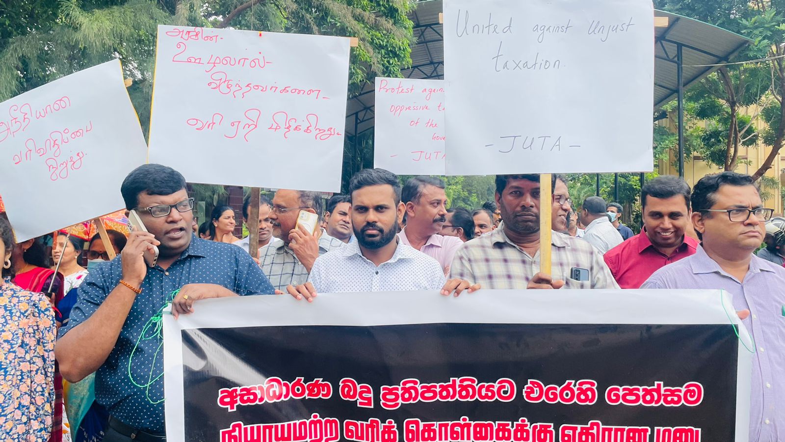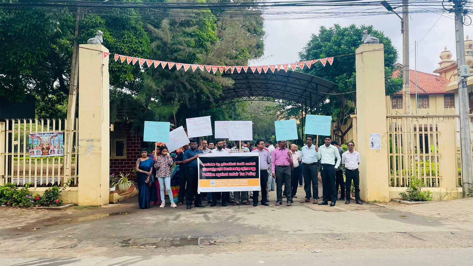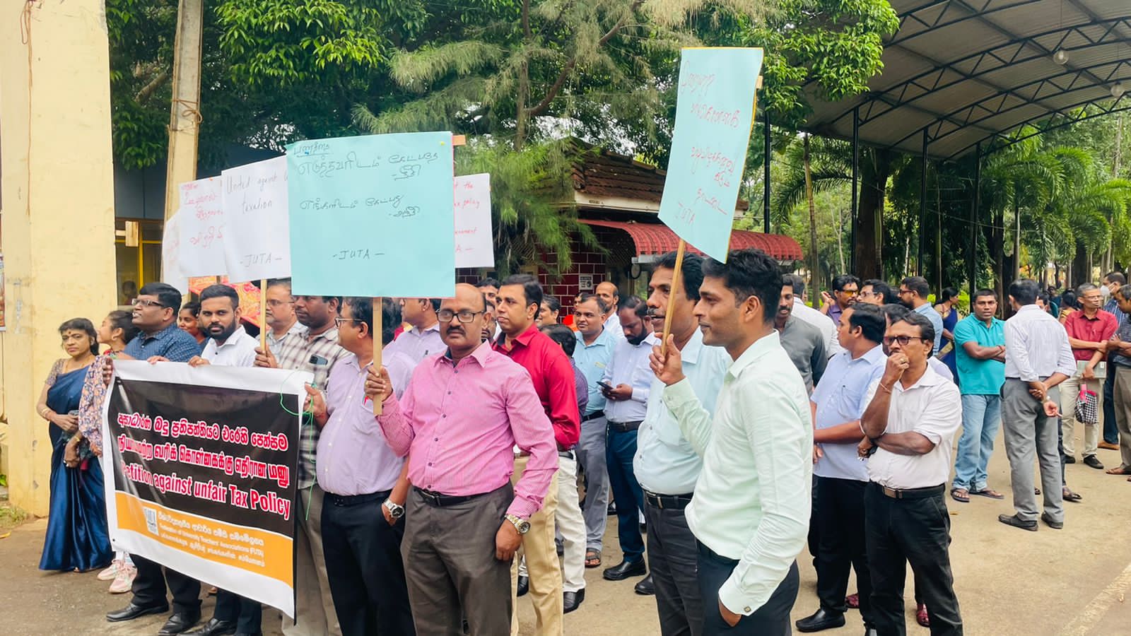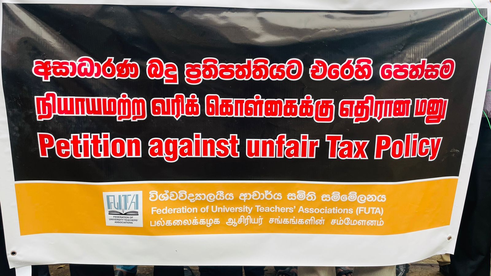 இதன் போது “அநீதியான வரிவிதிப்பை நிறுத்து”, “அரசின் ஊழலால் விழுந்தவர்களை வரி ஏறி மிதிக்கிறது”, “பணத்தை எடுத்தவரிடம் கேட்பதே நீதி எங்களிடம் கேட்பது அநீதி” போன்ற பதாகைகளை ஏந்தியாவாறு விரிவுரையாளர்கள் அமைதியான முறையில் கவனயீர்ப்புப் போராட்டத்தில் ஈடுபட்டனர்.