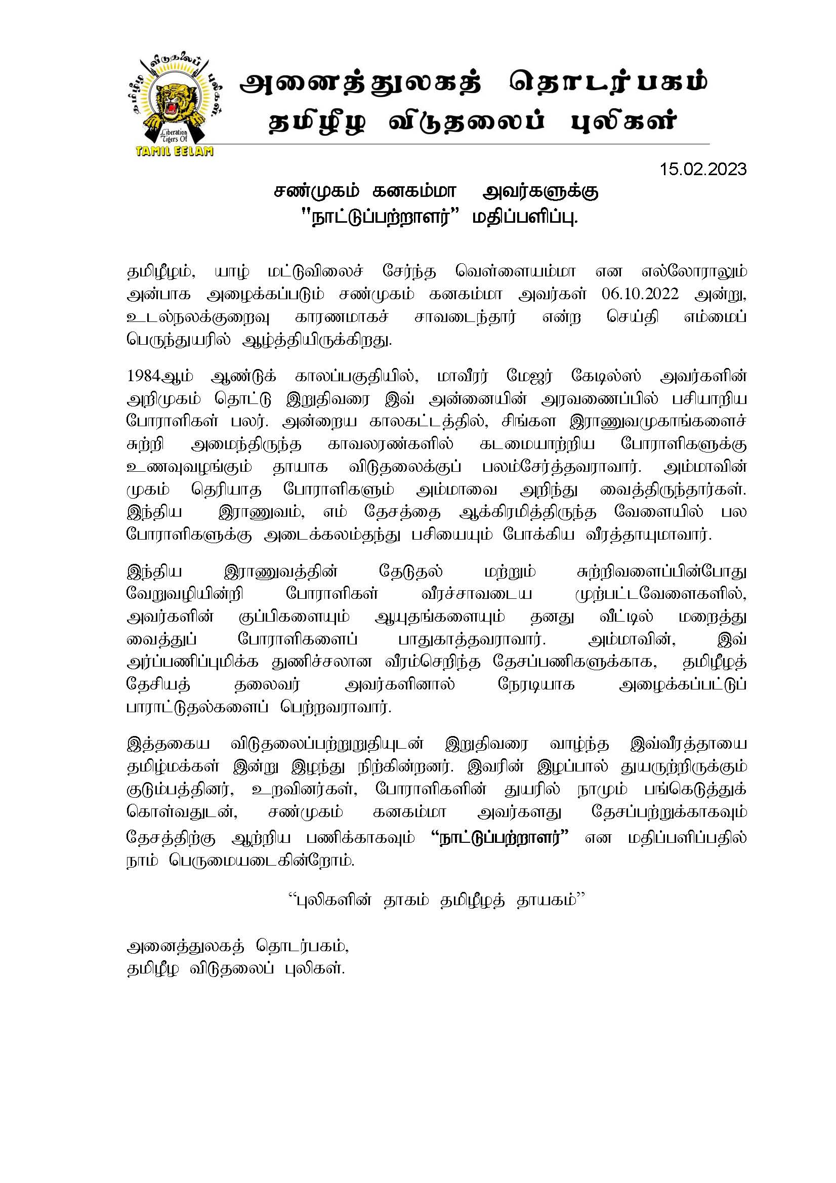 தமிழ்மக்கள் இன்று இழந்து நிற்கின்றனர். இவரின் இழப்பால் துயருற்றிருக்கும் குடும்பத்தினர், உறவினர்கள், போராளிகளின் துயரில் நாமும் பங்கெடுத்துக் கொள்வதுடன், சண்முகம் கனகம்மா அவர்களது தேசப்பற்றுக்காகவும் தேசத்திற்கு ஆற்றிய பணிக்காகவும் “நாட்டுப்பற்றாளர்‘‘ என மதிப்பளிப்பதில் நாம் பெருமையடைகின்றோம்.