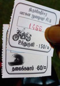 அதன் போது அங்குள்ள வாகன தரிப்பிடம் ஒன்றில் மோட்டார் சைக்கிளுக்கு 150 ரூபாயும் , தலைக்கவசம் ஒன்றிற்கு 60 ரூபாயும் அறவிட்டு அதற்கான பற்றுச்சீட்டுக்களையும் வழங்கி வருகின்றனர்.