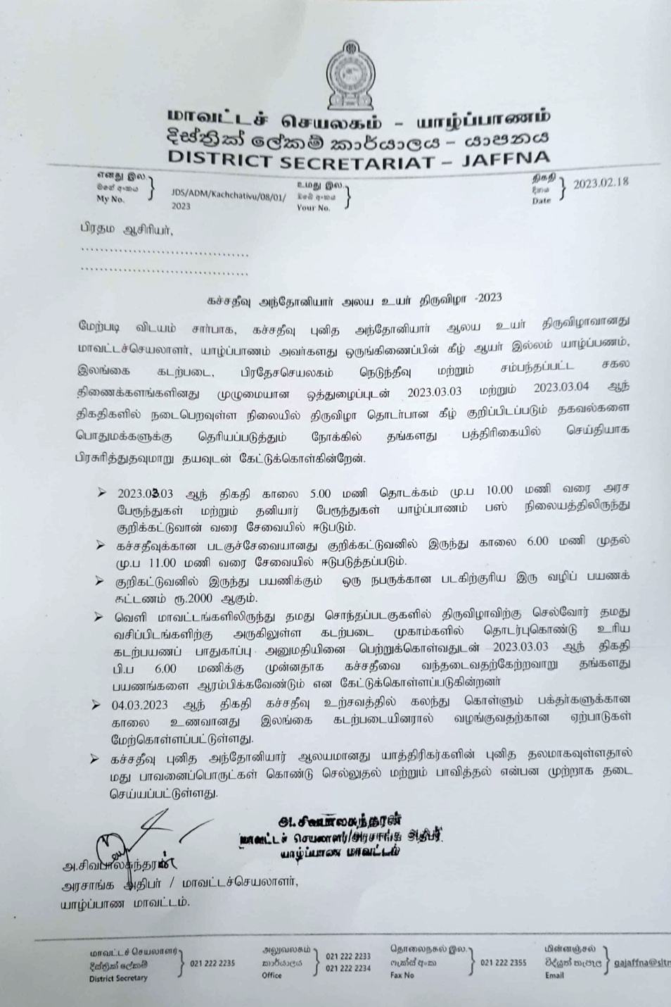 கச்சதீவு புனித அந்தோனியார் ஆலய திருவிழாவானது இம்முறை யாழ்ப்பாண மாவட்ட செயலாளரது ஒருங்கிணைப்பின் கீழ் யாழ்ப்பாண ஆயர் இல்லம் , இலங்கை கடற்படை, நெடுந்தீவு பிரதேச செயலகம் மற்றும் சம்பந்தப்பட்ட சகல திணைக்களங்களினதும் முழுமையான ஒத்துழைப்புடன் மார்ச் 03 மற்றும் 04 ஆம் திகதிகளில் நடைபெறவுள்ளது.