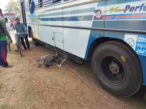 வவுனியா, ஏ9 வீதியில் உள்ள மூன்றுமுறிப்பு பகுதியில் துவிச்சக்கர வண்டியில் குடும்பஸ்தர் ஒருவர் பயணித்துக்கொண்டிருந்தபோது, கொழும்பில் இருந்து யாழ்ப்பாணம் நோக்கிச் சென்ற தனியார் பஸ் ஒன்று துவிச்சக்கர வண்டியின் மீது மோதியுள்ளது.