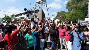 ‘வியர்வைத் துளிகளின் கூட்டமைப்பு’ எனும் சுதந்திர வர்த்தக வலய பெண்களுக்காக செயற்படும் அமைப்பு இந்த ஆர்ப்பாட்டத்தை ஏற்பாடு செய்திருந்தது.