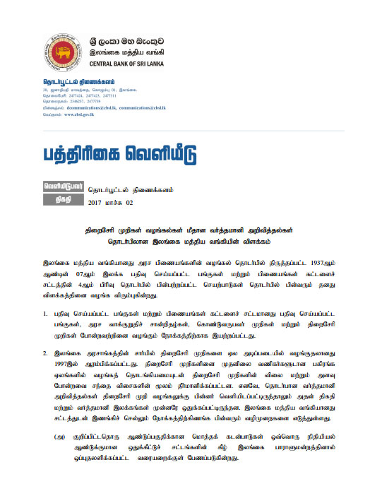 திறைசேரி முறிகள் வழங்கல்கள் மீதான வர்த்தமானி அறிவித்தலானது பதிவுசெய்யப்பட்ட பதிவு செய்யப்பட்ட பங்குகள் மற்றும் பிணையங்கள் கட்டளைச்சட்டத்தில் கூறப்பட்ட ஏற்பாடுகளுடன் இணங்கிச் செல்லும் விதத்திலுள்ளது என மத்திய வங்கி தெரிவித்துள்ளது.