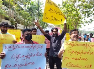 இன்று சனிக்கிழமை காலை 10.30 மணியளவில் யாழ் நகரில் ஒன்று கூடியவர்கள் திடீரென பேரணியாக வந்து ரிம்மர் மண்டபம் முன்பாக ஒன்றுகூடி போராட்டத்தில் ஈடுபட்டனர்.