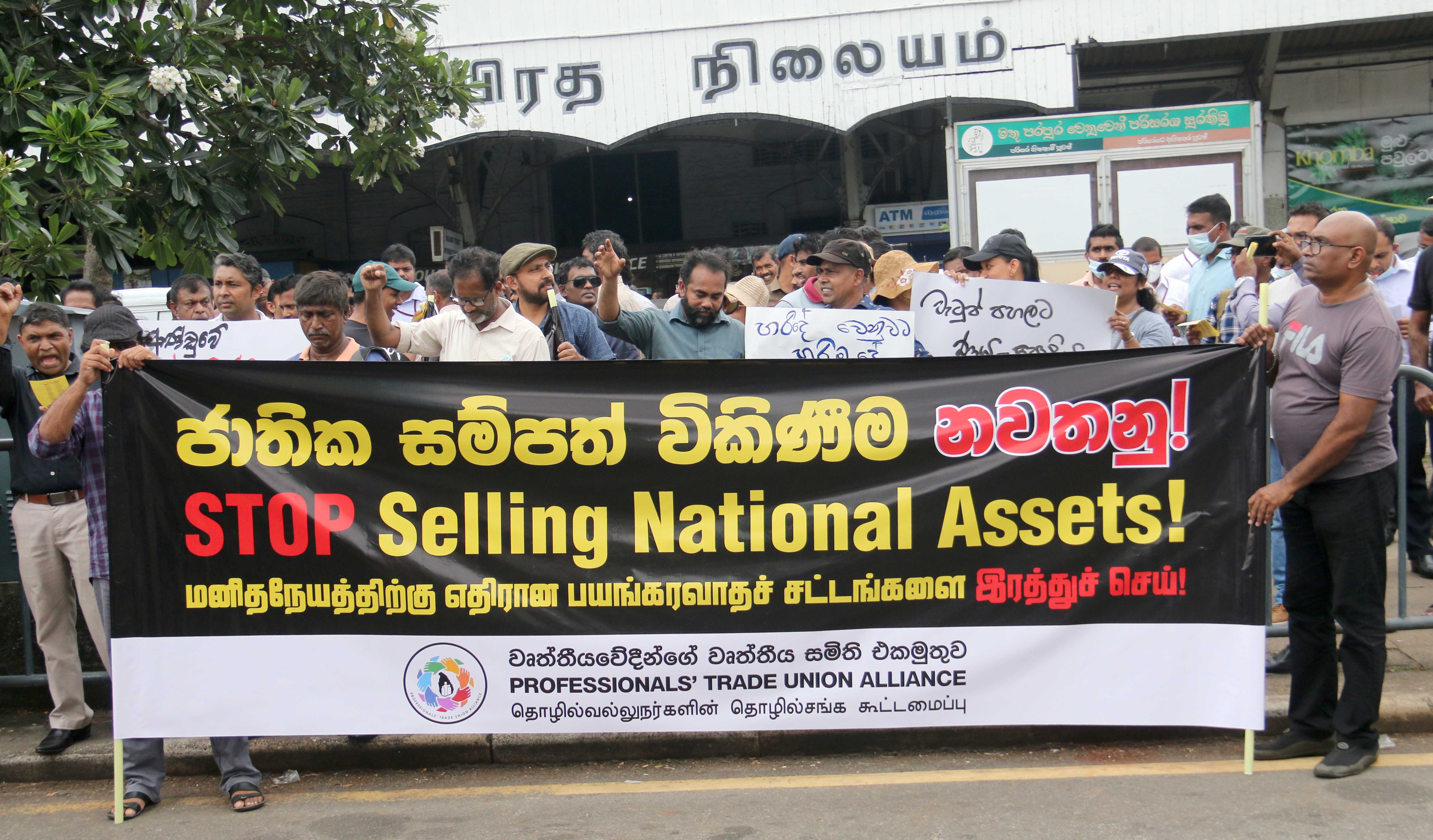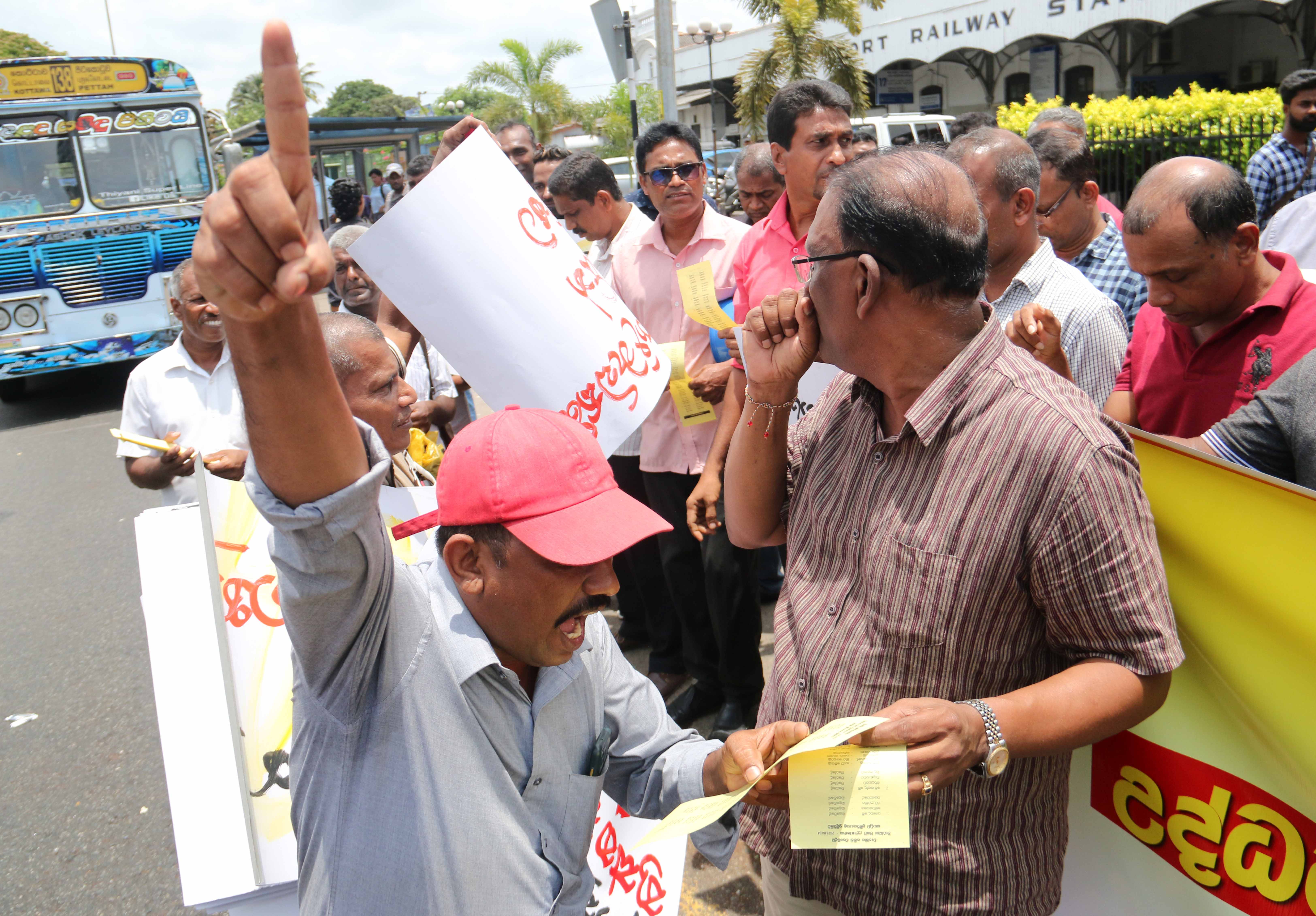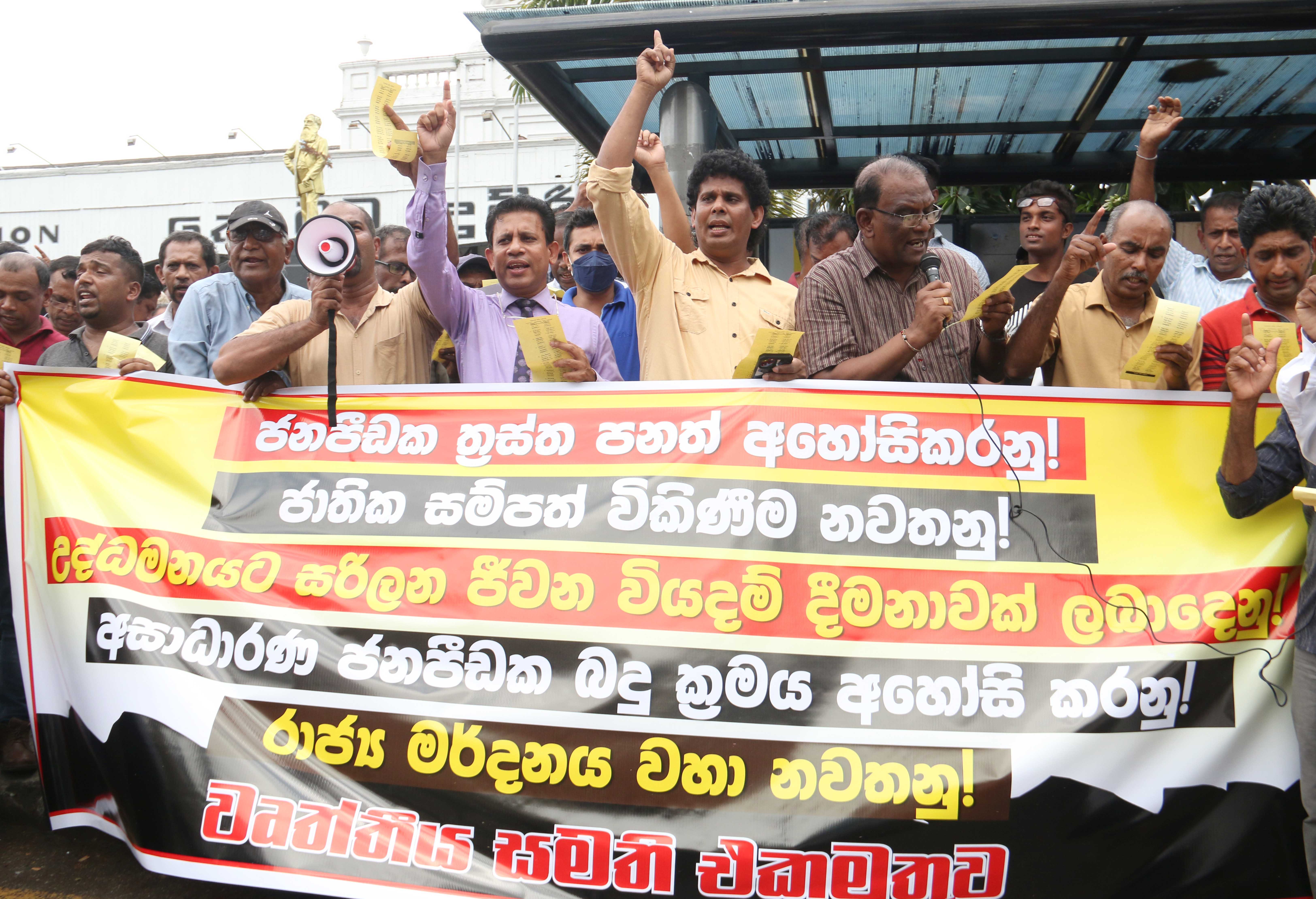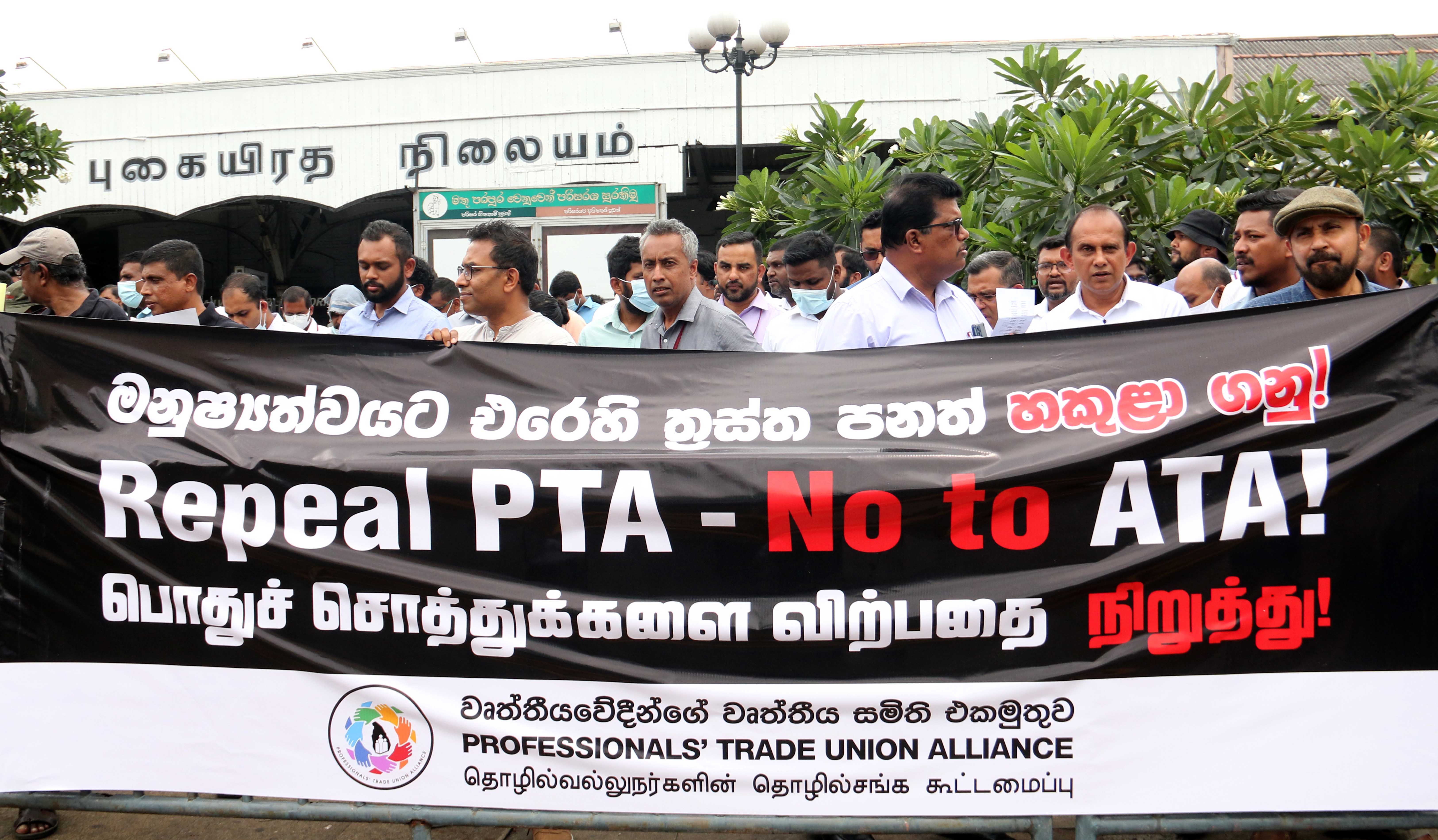 நாட்டில் பயங்கரவாத தடுப்பு சட்ட மூலத்தை அமுல்படுத்துவதற்கு எதிர்ப்பு தெரிவித்தும் நாட்டின் வளங்களை வெளிநாடுகளுக்கு கொடுப்பதை நிறுத்தக் கோரியும் ஒன்றிணைந்த தொழிற்சங்கங்களின் கூட்டமைப்பினர் கொழும்பு கோட்டை ரயில் நிலையத்திற்கு முன்னால் இன்று ஆர்ப்பாட்டமொன்றை முன்னெடுத்தனர்.