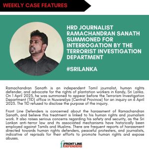 மலையகத் தமிழர்களின் தேசியத்தை அங்கீகரித்து அவர்களுக்கு காணி உரிமை வழங்கக் கோரி கொழும்பில் கிதுசர குழுவினர் போராட்டம் நடத்திய தினத்தன்று, பயங்கரவாத எதிர்ப்பு மற்றும் புலனாய்வுப் பிரிவின் அதிகாரிகள் முன்னாள் நாடாளுமன்ற ஊடகவியலாளர் இராமச்சந்திரன் சனத்திடம் விசாரணை நடத்தியுள்ளனர்.இந்நிலையில் பயங்கரவாத எதிர்ப்பு மற்றும் புலனாய்வுப் பிரிவு (CTID) ஊடகவியலாளரை வரவழைத்தமை அவரது பாதுகாப்பிற்கு அச்சுறுத்தல் என உலகளவில் மனித உரிமை ஆர்வலர்களின் பாதுகாப்பிற்காக செயற்படும் சர்வதேச அமைப்பு கண்டித்துள்ளது.