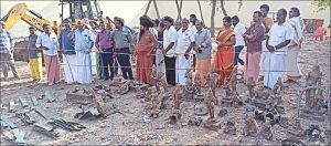 இந்நிலையில், யாகசாலை அமைக்க மண் எடுப்பதற்காக, கோயில் உட்புறத்தில் மேற்கு கோபுர வாசல் அருகே நேற்று பொக்லைன் மூலம் பள்ளம் தோண்டப்பட்டது. 2 அடி ஆழத்தில் தோண்டியபோது, அங்கு சுவாமி சிலைகள், பூஜை பொருட்கள் உள்ளிட்டவை இருப்பது தெரியவந்தது. தொடர்ந்து, அந்த இடத்தில் தோண்டியபோது விநாயகர், முருகன், வள்ளி, தெய்வானை, சோமாஸ்கந்தர், அய்யனார், திருஞானசம்பந்தர், அப்பர், சுந்தரர், மாணிக்கவாசகர் உட்பட 23 சுவாமிகளின் உலோகச் சிலைகள் கிடைத்தன. இவை அரை அடி முதல் 2 அடி வரை உயரம் கொண்டவையாக இருந்தன. மேலும், 410 முழுமையான செப்பேடுகள், சேதமடைந்த நிலையில் 83 என 493 செப்பேடுகள், 16 பூஜைப் பொருட்கள், 15 பீடங்கள், 50 கிலோ அளவிலான சேதமடைந்த நிலையில் உள்ள உலோகப் பொருட்கள், கலசங்கள் உள்ளிட்டவை கண்டெடுக்கப்பட்டுள்ளன.