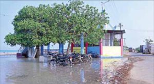 தூத்துக்குடி தாளமுத்துநகர் மொட்டை கோபுரம் பகுதி, ராஜபாளையம் பகுதியில் 3 ஆண்டுகளுக்கு பின்னர் நேற்று கடல்நீர் கரையைத் தாண்டி சுமார் 60 அடி தூரம் ஊரை நோக்கி வந்து, சாலையை தொட்டு தேங்கி நின்றது. கடற்கரையில் உள்ள மீன் ஏலக்கூடம், ஆலயம் உள்ளிட்டவற்றை கடல்நீர் சூழ்ந்தது. கடல் அலையின் வேகமும் அதிகமாக இருந்தது.