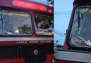 உந்துருளியில் வந்த இருவர் பேருந்து மீது கல்வீசி தாக்குதல் மேற்கொண்டுள்ளார்கள் இதன்போது பேருந்தின் முன் கண்ணாடி சேதமடைந்துள்ளதுடன் சாரதியும் பாதிக்கப்பட்டுள்ளார்.