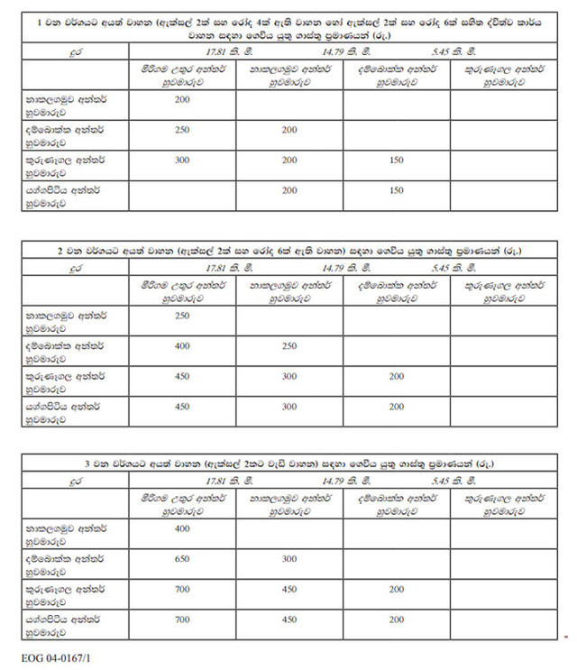 அதன்படி,போக்குவரத்து, நெடுஞ்சாலைகள் மற்றும் வெகுஜன ஊடக அமைச்சர் பந்துல குணவர்தனவினால் வெளியிடப்பட்டுள்ள வர்த்தமானியில், அதிவேக வீதிகளை பயன்படுத்தும் வாகன சாரதிகளுக்கான புதிய கட்டணங்கள் கட்டணம் பின்வருமாறு குறிப்பிடப்பட்டுள்ளது.