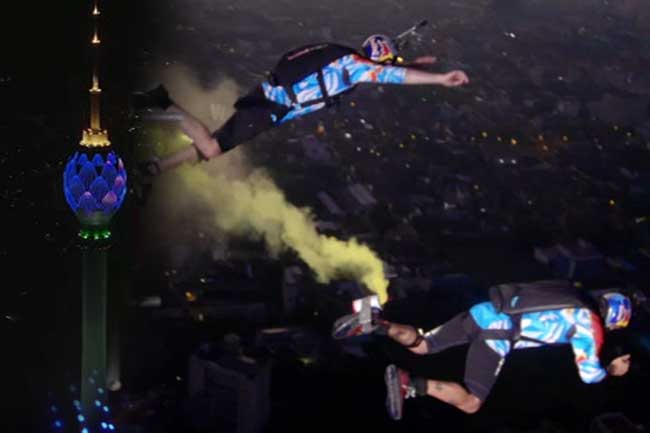 கண்காட்சி நிகழ்வாக முதல் முறையாக தாமரை கோபுரத்தில் இருந்து கீழே குதித்து பார்வையாளர்களை ஆச்சரியப்படுத்தினர்.