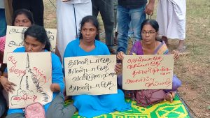 மழைக்கு மத்தியிலும் போராட்டகாரர்கள் பதாகைகளை தாங்கியவாறு போராட்டத்தில் ஈடுபட்டு வருகின்றனர்.