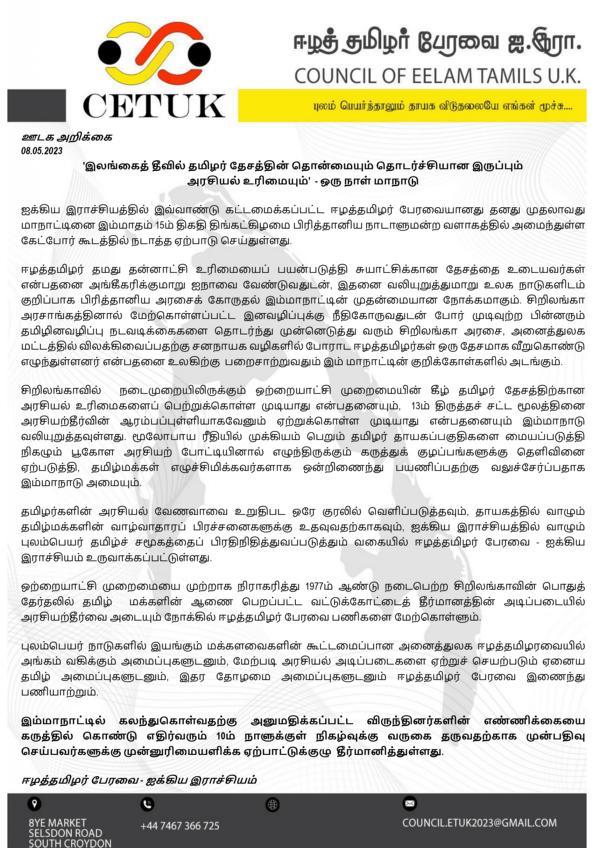 ஐக்கிய இராச்சியத்தில் இவ்வாண்டு கட்டமைக்கப்பட்ட ஈழத்தமிழர் பேரவையானது தனது முதலாவது மாநாட்டினை இம்மாதம் 15ம் திகதி திங்கட்கிழமை பிரித்தானிய நாடாளுமன்ற வளாகத்தில் அமைந்துள்ள கேட்போர் கூடத்தில் நடாத்த ஏற்பாடு செய்துள்ளது.