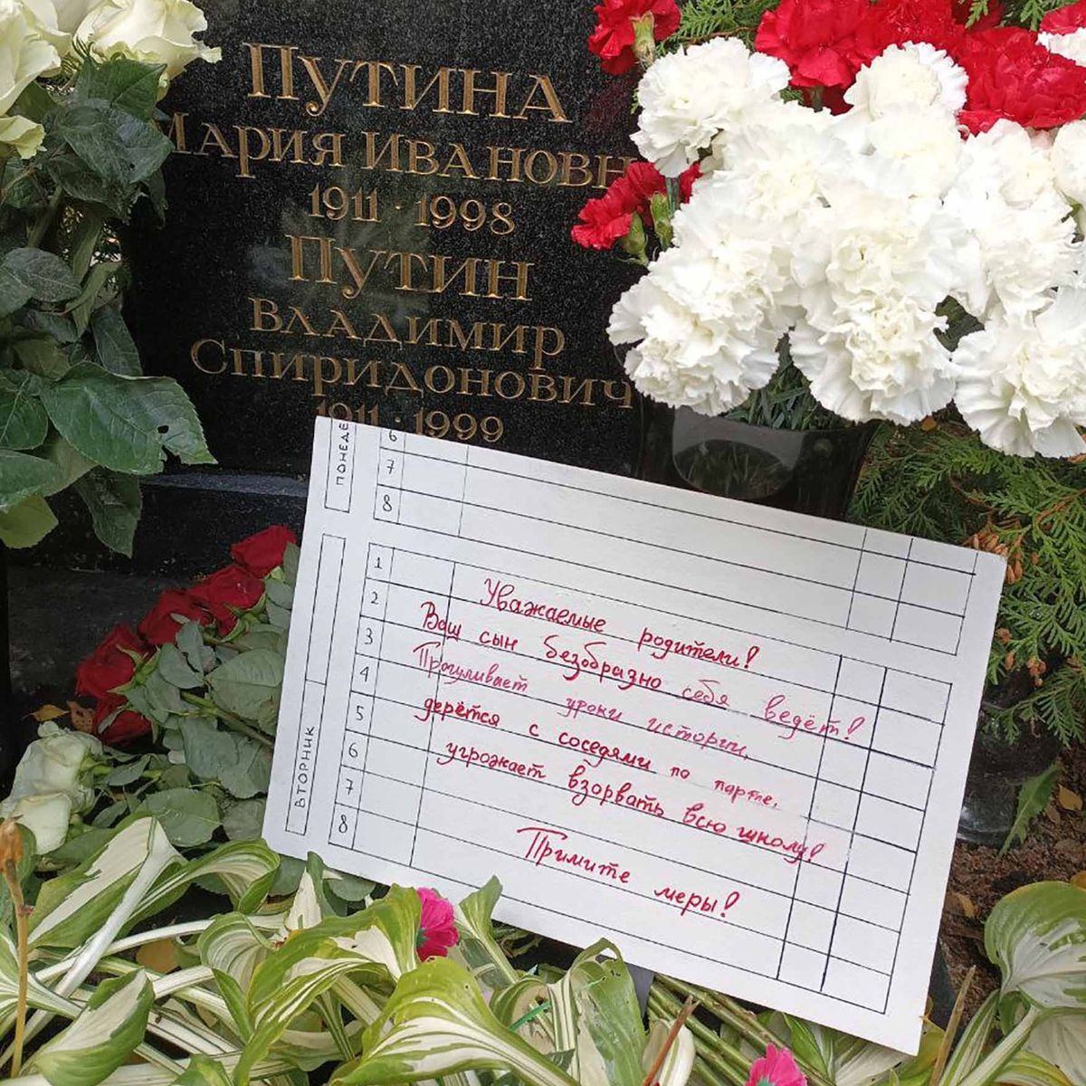 புட்டினின் பெற்றோரின் புதைகுழிக்கு அருகில் குறிப்பிட்ட வெறிபிடித்தவரின் பெற்றோர் என குறிப்பொன்றை விட்டுச்சென்றார் என சுயாதீன ஊடகங்கள் தெரிவித்துள்ளன.