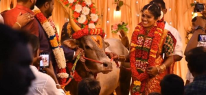 முன்னதாக, ஜல்லிக்கட்டு காளையை மணமேடையில் ஏற்றி மணமகனுக்கு அறிமுகம் செய்தார். தொடர்ந்து மணமகனும் மணமகளும் ஜல்லிக்கட்டு காளைக்கு முத்தமிட்டு புகைப்படங்களை எடுத்துக்கொண்டனர்.