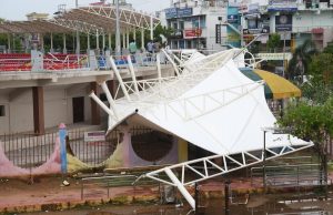 கூரைகள் சரிந்தன: இந்நிலையில் நேற்று முன்தினம் பிற்பகலில் பலத்த காற்றுடன் அரைமணி நேரம் பெய்த மழைக்கே தாக்குப்பிடிக்காமல் இந்த மைதானத்தின் மேற்குப்புறத்தில் இருந்த கூரைகளின் இரும்பு தூண்கள் உடைந்து கூரைகள் சரிந்து விழுந்தன. அப்போது ஆட்கள் நடமாட்டம் இல்லாததால் அசம்பாவிதங்கள் நிகழவில்லை.