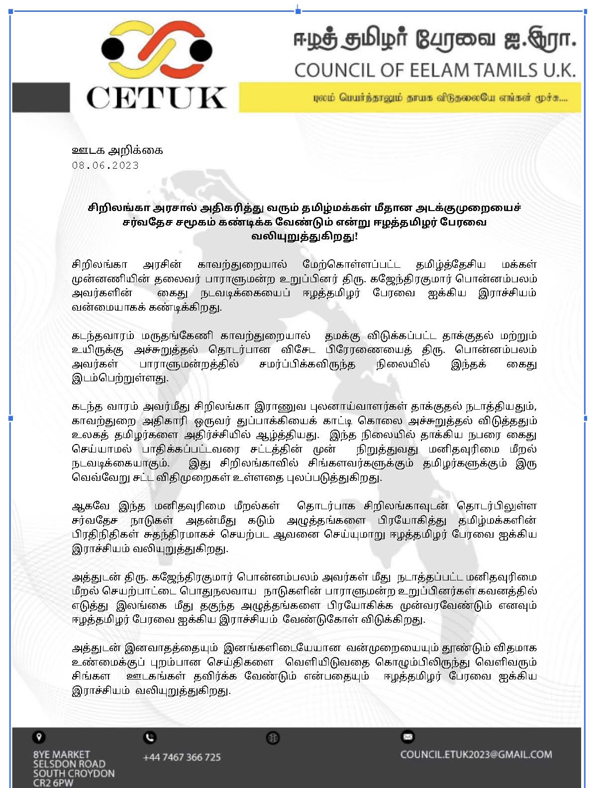 அத்துடன் திரு. கஜேந்திரகுமார் பொன்னம்பலம் அவர்கள் மீது நடாத்தப்பட்ட மனிதவுரிமை மீறல் செயற்பாட்டை பொதுநலவாய நாடுகளின் பாராளுமன்ற உறுப்பினர்கள் கவனத்தில் எடுத்து இலங்கை மீது தகுந்த அழுத்தங்களை பிரயோகிக்க முன்வரவேண்டும் எனவும் ஈழத்தமிழர் பேரவை ஐக்கிய இராச்சியம் வேண்டுகோள் விடுக்கிறது.
