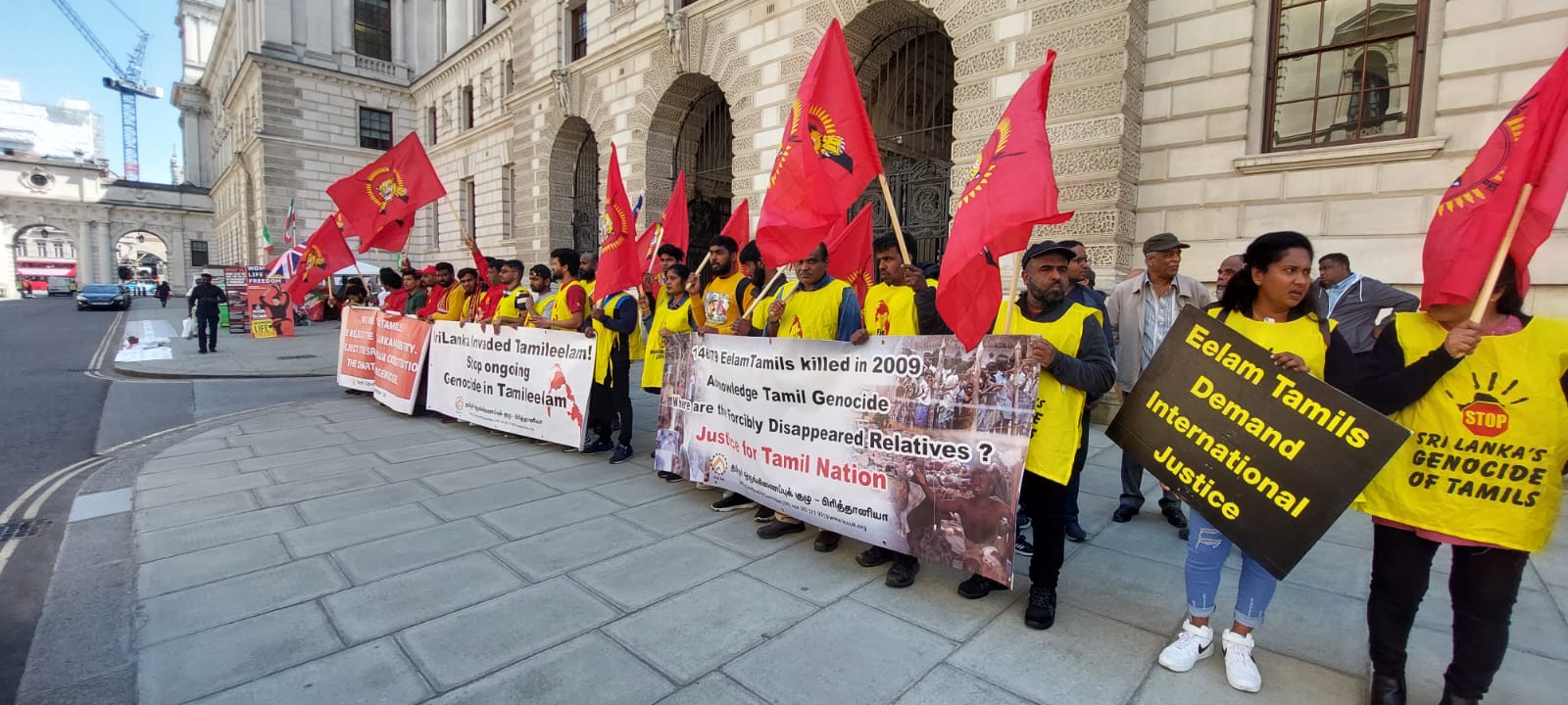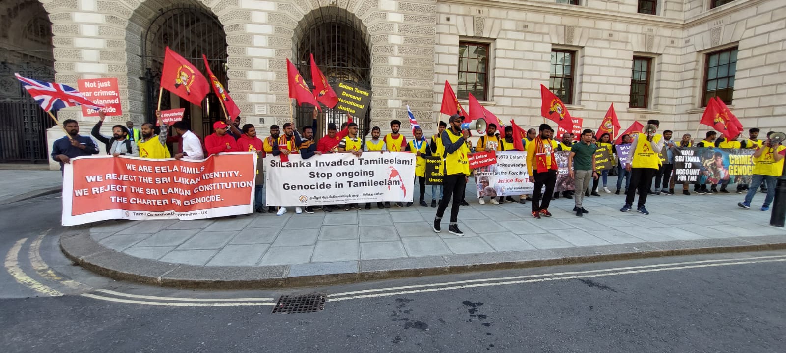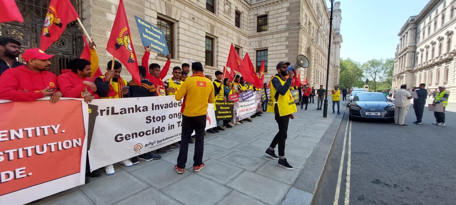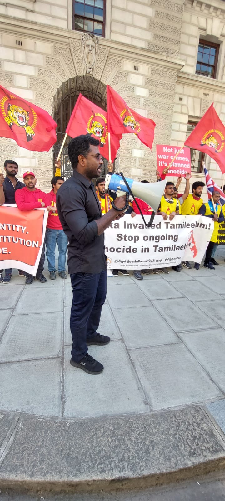 தமிழர்களின் தாயகம் தேசியம் தன்னாட்சி உரிமைக்காக தாயகத்தில் தொடர்ச்சியாகப் போராடிவரும் தமிழ் மக்களின் பாராளுமன்ற உறுப்பினர் திரு. கஜேந்திரகுமார் பொன்னம்பலம் அவர்கள் மற்றும் ஏனைய தமிழ்ச்சமூக அரசியற் செயற்பாட்டாளர்களின் சட்டவிரோதமான கைது நடவடிக்கையைக் கண்டித்தும் சிறிலங்கா அரசால் தொடர்ந்து தமிழர்கள் மீது மேற்கொள்ளப்படும் அடக்குமுறையை எதிர்த்தும் பிரித்தானிய அரசை இவ்விடயத்தில் தலையிடக்கோரியும் பிரித்தானிய வெளியுறவுத்துறை அலுவலகத்திற்கு முன்பாக கண்டனப் போராட்டம் இன்று King Charles St, London SW1A 2AH மாலை 2 மணி அளவில் அகவணக்கத்துடன் ஆரம்பமாகி நடைபெற்றது.